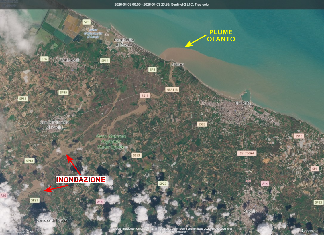 Il trasporto dei sedimenti in mare visto da satellite, dopo il ciclone Erminio 05/04/2026 - Le abbondanti precipitazioni associate al ciclone Erminio hanno determinato la piena di numerosi corsi d'acqua lungo il versante adriatico, dalle Marche alla Puglia. I satelliti europei del Programma Copernicus hanno acquisito immagini molto utili per l'osservazione e l'analisi dei fenomeni geo-idrologici attivatisi durante l'evento. L'immagine sotto è stata acquisita da uno dei satelliti della costellazione… Leggi l'articolo completo
